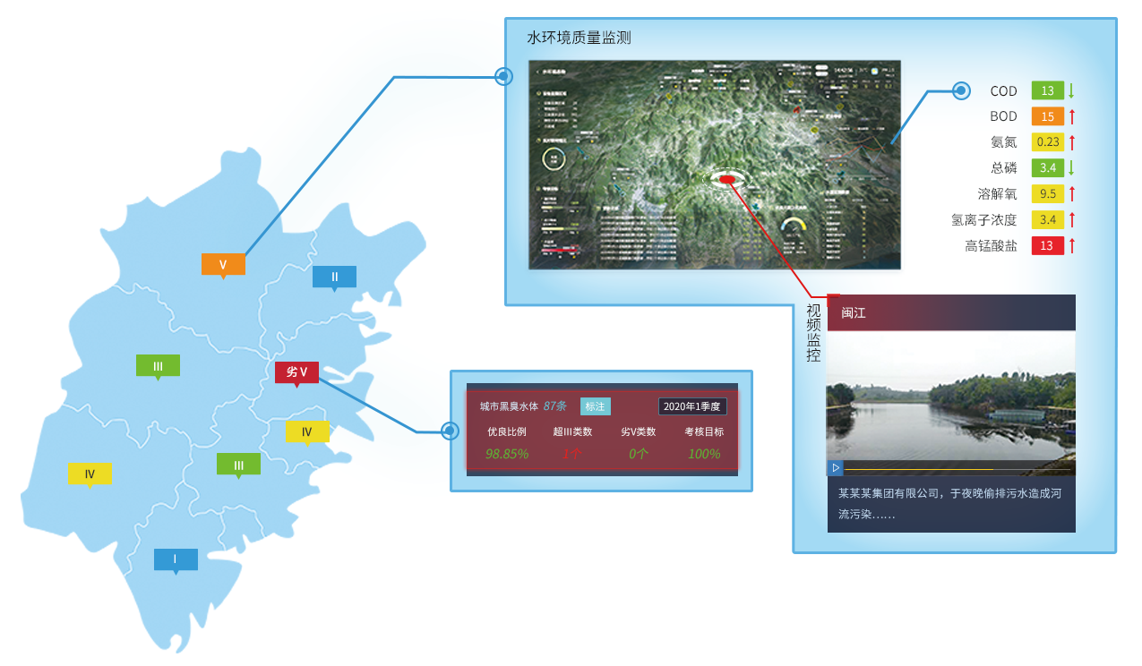 在水源地、流域、生態(tài)紅線區(qū)的重點區(qū)域建立高清視頻監(jiān)控點,實現(xiàn)全天候?qū)λ吹?、流域、生態(tài)紅線區(qū)的重點區(qū)域的水質(zhì)監(jiān)測,為監(jiān)管人員及時提供地區(qū)的水質(zhì)環(huán)境情況。